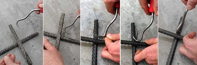 Для фиксации хомутов на продольных прутьях используется стальная отожженная проволока диаметром от 1,2 до 1,4 мм. Длина данного промежутка должна быть не менее 150 мм. Проволока складывается вдвое и скручивается с помощью воротка, но в процессе натяжения необходимо следить за тем, чтобы она не разорвалась.