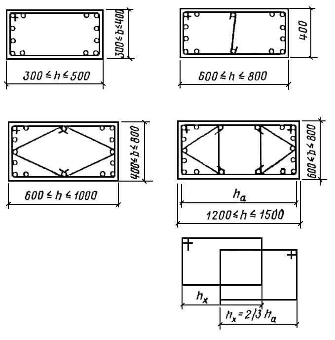 В трёх случаях устанавливаются стягивающие элементы: в колоннах и фундаментных лентах, при превышении одной из сторон конструкции 500 мм., в балках, высотой более 600 мм., а также в плитах для стяжки верхней и нижней поперечных сеток.